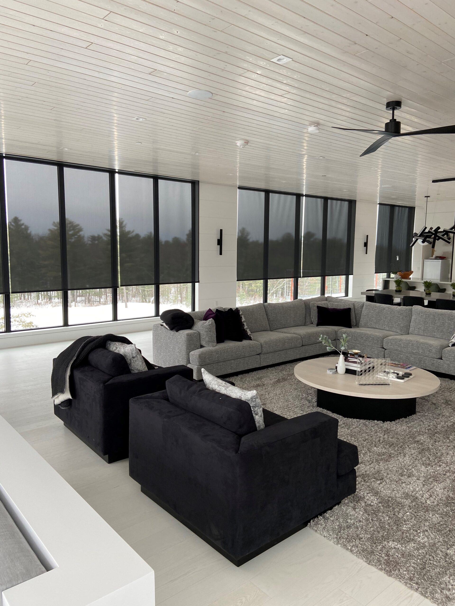 Designed to provide both light control and UV protection while maintaining a view to the outside. They are made from a special fabric that combines openness and density, allowing light to filter through while reducing glare and heat.